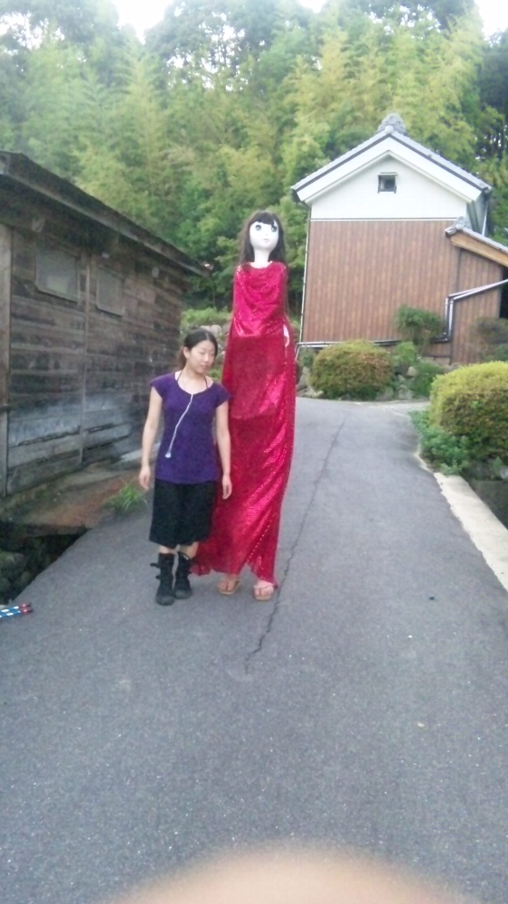 背景のお隣の家の蔵や緑に、イェイイェイのドレスの真っ赤な色がやたらに映える。